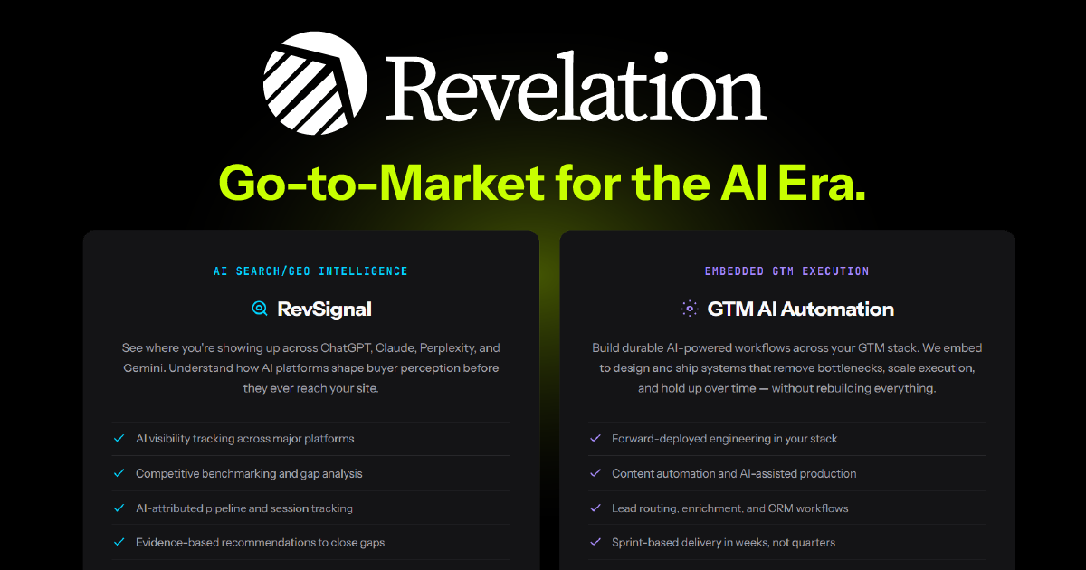 Some teams need clarity into how they're showing up in AI-driven discovery. Others need systems that turn intent, content, and data into reliable execution at scale. Many need both, but not always at the same time. Revelation provides the intelligence and execution layer GTM teams use to operate in this new reality, without forcing a single path or one-size-fits-all approach.